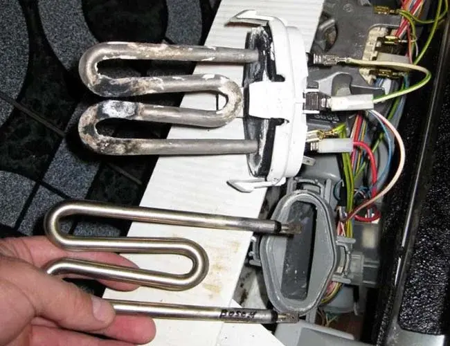 Обзор мастера: при диагностике мастер обнаружил неисправность нагревательного элемента (ТЭНа) из-за образования накипи и выход из строя термодатчика, который не передавал сигнал о недостаточной температуре воды. Также выявлено повреждение изоляции проводки, ведущей к нагревательному элементу.